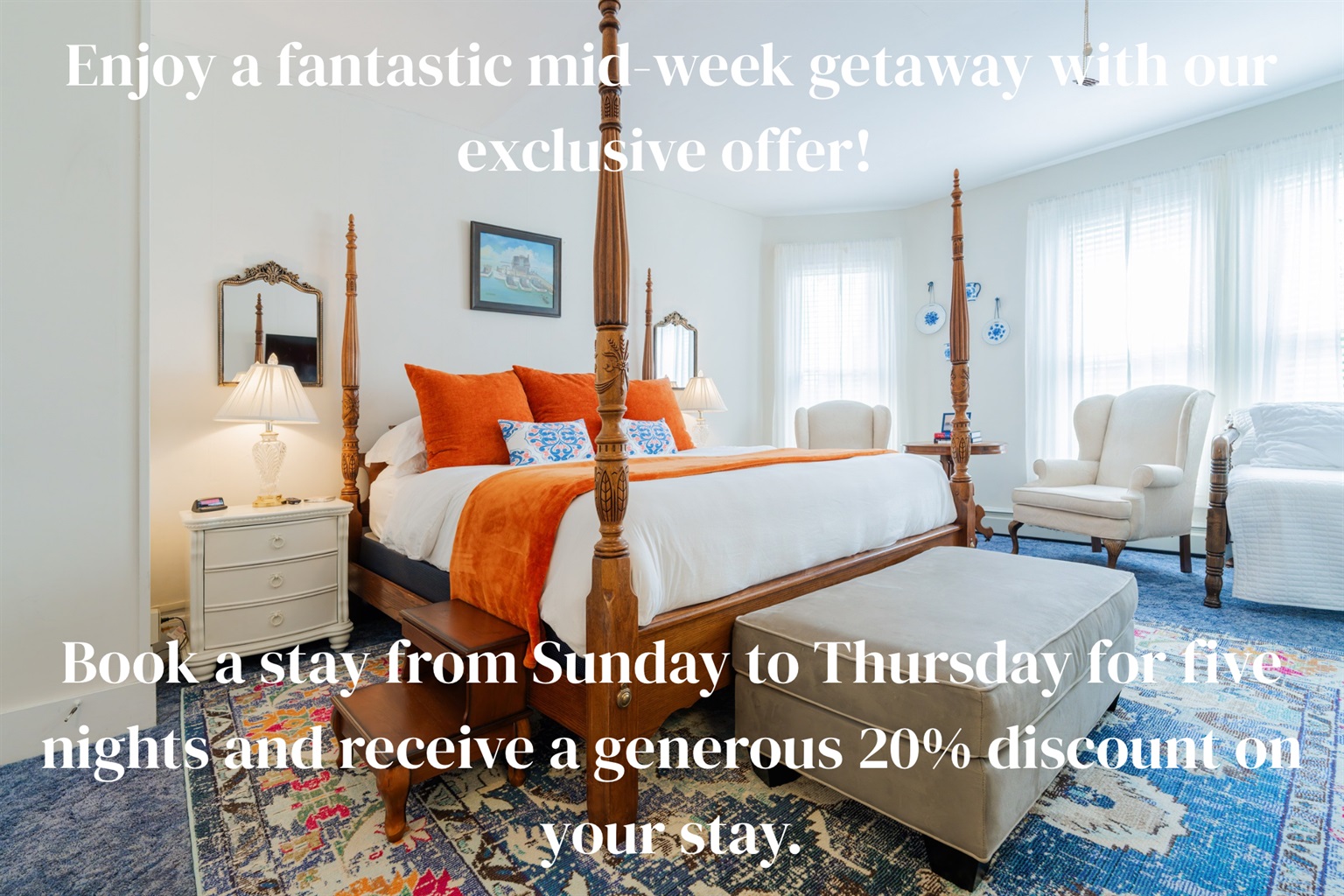 Midweek Escape — 20% OffDiscover the best-kept secret in Marblehead travel! Enjoy peace, privacy, and premium suites at The Victorian Inn when you stay Sunday through Thursday for a 5-night stay. Avoid the crowds at local attractions, savor uninterrupted lakeside mornings, and take advantage of exclusive midweek savings. Perfect for romantic getaways, family trips, or wellness escapes — your tranquil Lake Erie retreat awaits. Discount is not applicable for events or entire Inn rentals. Holidays and some Blackout Dates apply. Discounts cannot be combined; only one may be applied per stay. |