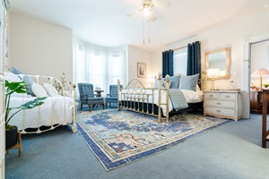 Charming details like a quaint dresser, a warm-toned reading lamp with usb charging, and vintage-inspired décor enhance the room’s tranquil vibe, making it one of our most inviting accommodations. The private en-suite bathroom is tastefully updated while still reflecting the inn’s Victorian character.